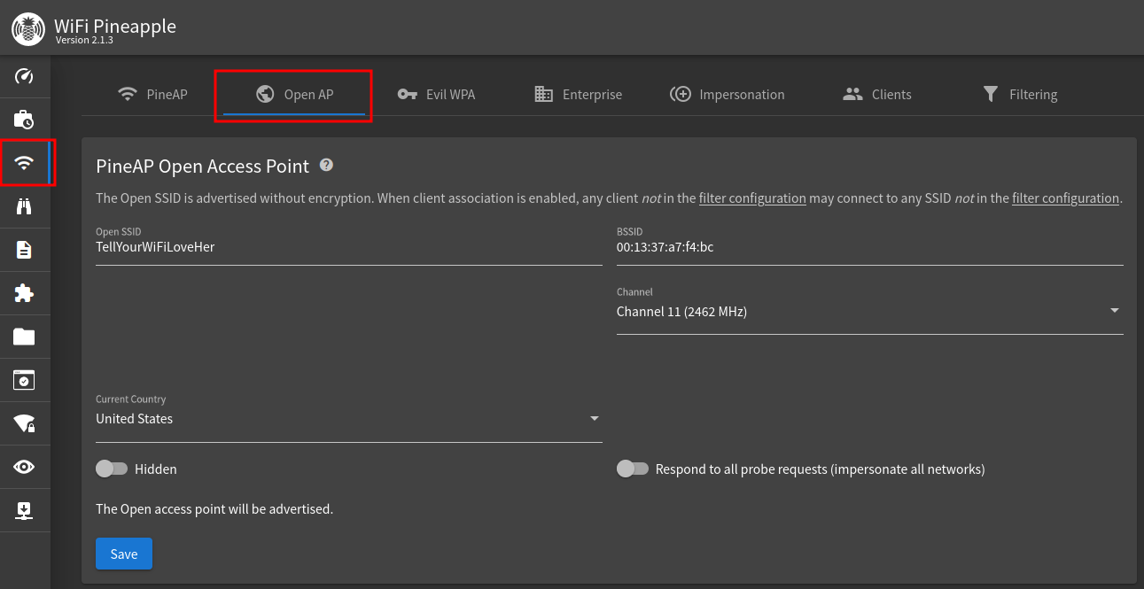 Now, we go to our OpenAP, set the desired WiFi name, BSSID, and channel.