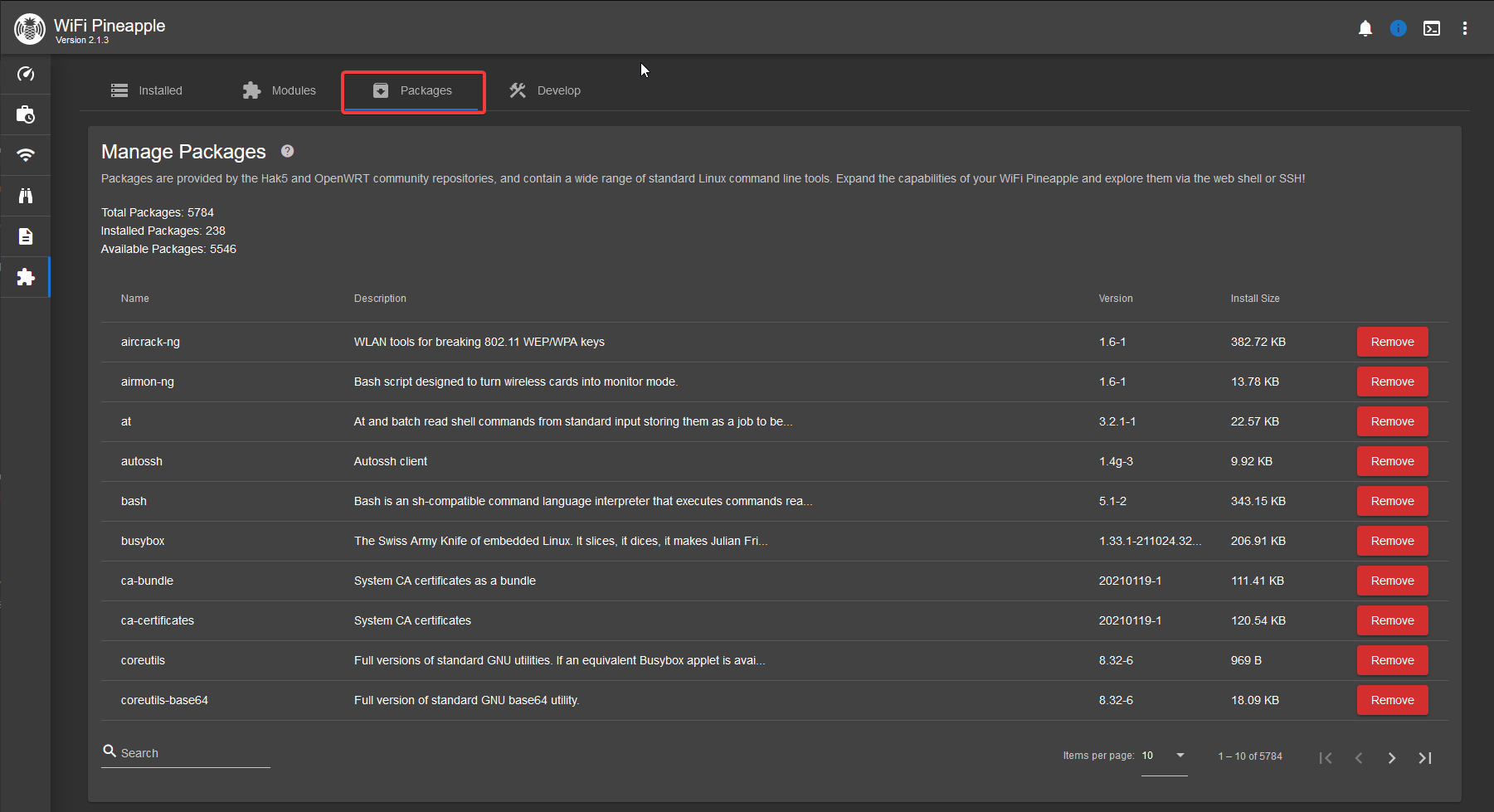 Packages are provided by the Hak5 and OpenWRT community repositories, and contain a wide range of standard Linux command line tools. There's are A LOT of modules, so use the search function to find some or scroll through the list to grab any that interest you.